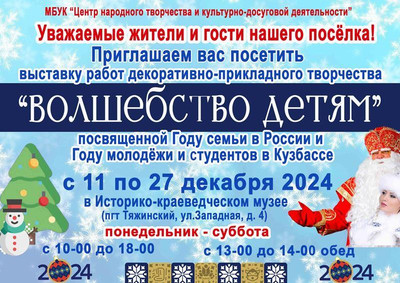 С 11 по 27 декабря 2024 года приглашаем всех желающих в историко-краеведческий музей посетить выставку работ мастеров декоративно-прикладного творчества "Волшебство детям". Представлены работы руководителей и участников кружков ДПИ сельских Домов культуры и клубов, специалистов Тяжинской центральной окружной библиотеки имени Н.И.Масалова, обучающихся МБОУ "Тяжинская средняя общеобразовательная школа №2", обучающихся МБОУ "Тяжинская средняя общеобразовательная школа №3", обучающихся МБОУ "Итатская средняя общеобразовательная школа имени Т.Ф.Данкевмч". Выставку можно посмотреть по адресу: пгт Тяжинский, ул.Западная, 4.