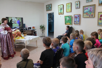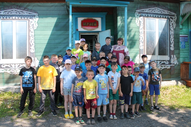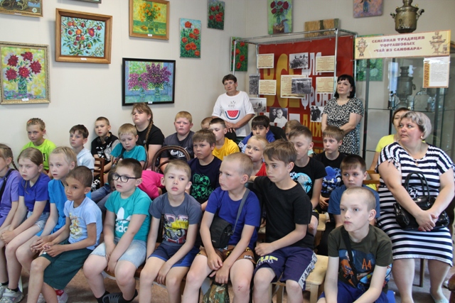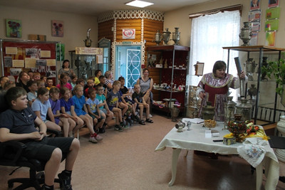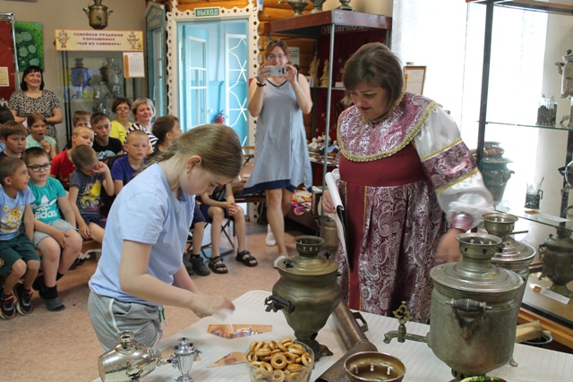 Сотрудники Тяжинского историко-краеведческого музея в рамках акции «Лето с музеем» и рамках Года семьи провели для детей из летнего лагеря «Радуга» Листвянской СОШ музейный урок «Посиделки у самовара» и обзорную экскурсию по музею.