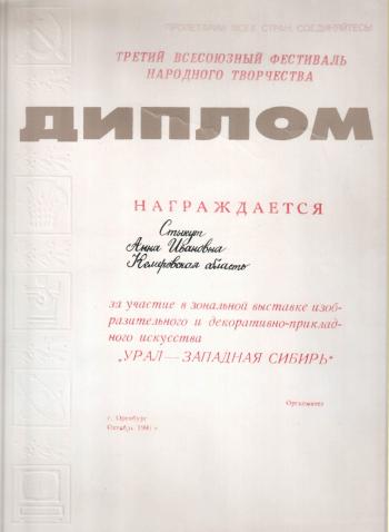 Родившись в 1922 году в Тяжинском районе, она прожила здесь много лет. Анна Ивановна была полна любви к родному краю, к нашей суровой, уникальной по красоте природе. Не получив специального художественного образования, эта удивительная женщина овладела техникой живописи, росписи по ткани, а приемы декоративно-прикладного искусства, наверное, впитала с молоком матери. В ее работах талантливо раскрывается душа Сибири. Она знала и любила свой край, своих земляков.