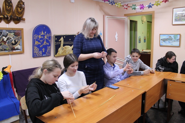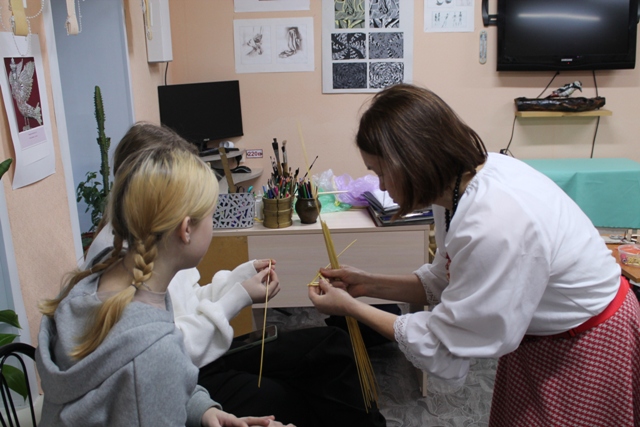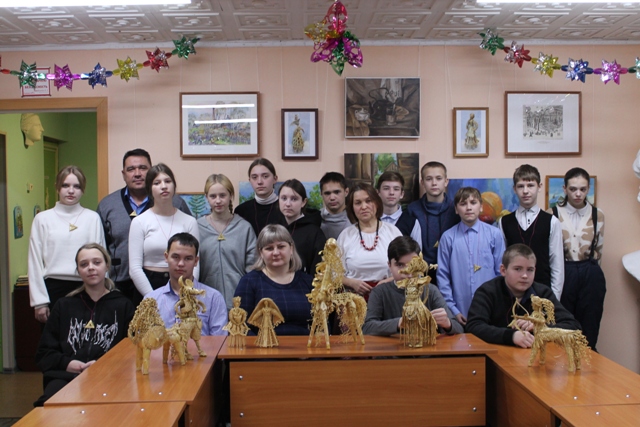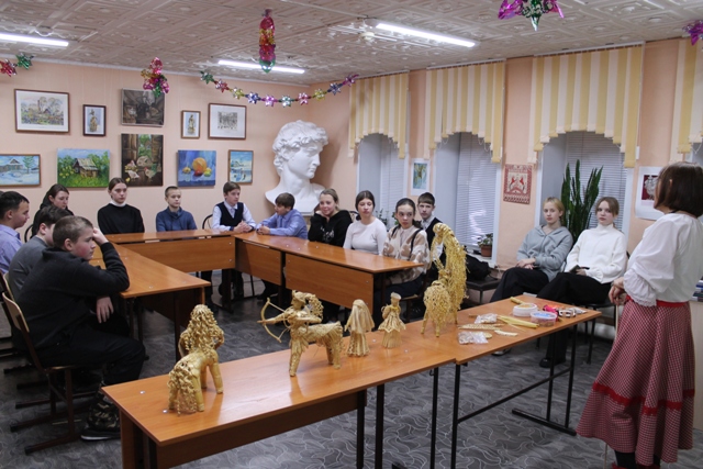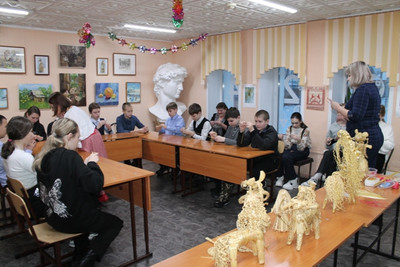 Двадцатого декабря для учащихся МБОУ «Тяжинская средняя школа №1» была проведена экскурсия по Детской художественной школе №13 и организована встреча с народным мастером Кузбасса Емельяновой Натальей Николаевной. С неподдельным интересом и вниманием ребята слушали рассказ Натальи Николаевны о школе, о профессии художника, о её творчестве. С детьми был проведен мастер-класс по изготовлению оберега из соломки.