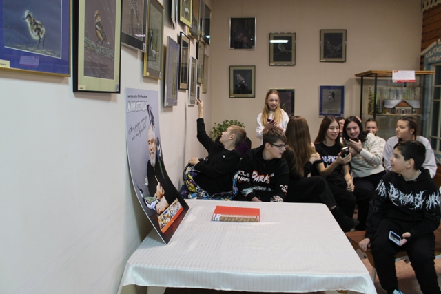 Сотрудники музея провели экскурсию по выставке, разнообразили свой рассказ загадками о птицах, которые изображены на картинах. А еще в выставочном зале звучала полифония птичьего пения. Кульминацией экскурсии стал просмотр фильма об Юрии Михайловиче «Я счастливый человек».