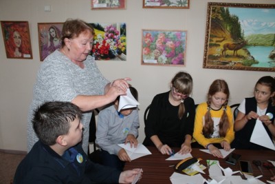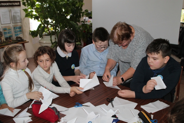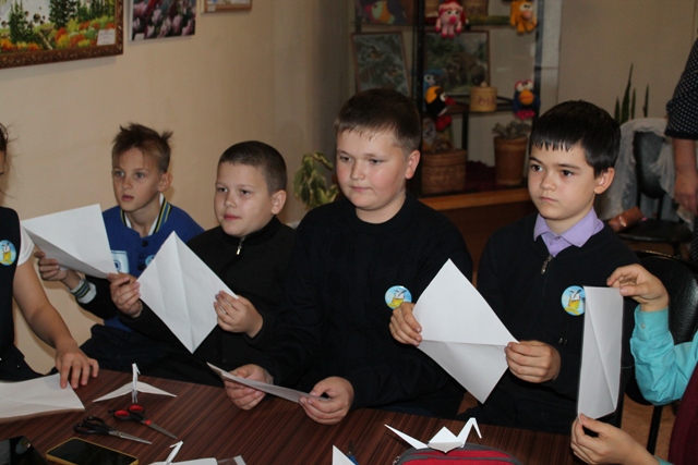 Кузина Ольга Георгиевна – заведующий Октябрьской библиотекой провела с ребятами мастер-класс по изготовлению журавликов в технике оригами. Дети с увлечением и особым усердием были вовлечены в работу. Итогом стала общая фотография всех участников мероприятия.